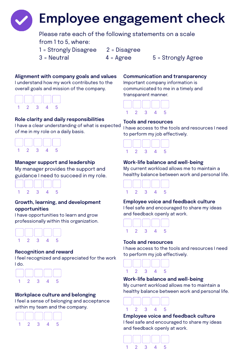 That’s why we’ve put together this employee survey questions template with the big employee engagement topics in mind, so you can get the answers you need quickly and meaningfully: